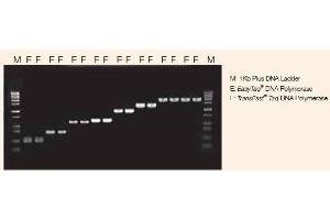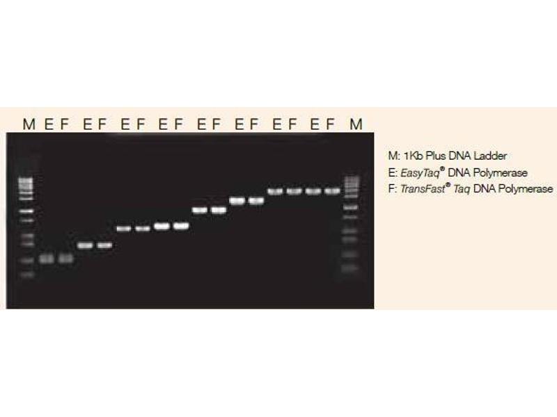 TransFast® Taq DNA Polymerase has passed the following quality control assays: functional absence of double- and single-strand endonuclease activity, >99% homogeneous measured by SDS-PAGE. Each batch of TransFast® Taq DNA Polymerase has been assayed for amplification efficiency to amplify p53 gene from 10 ng of human genomic DNA.