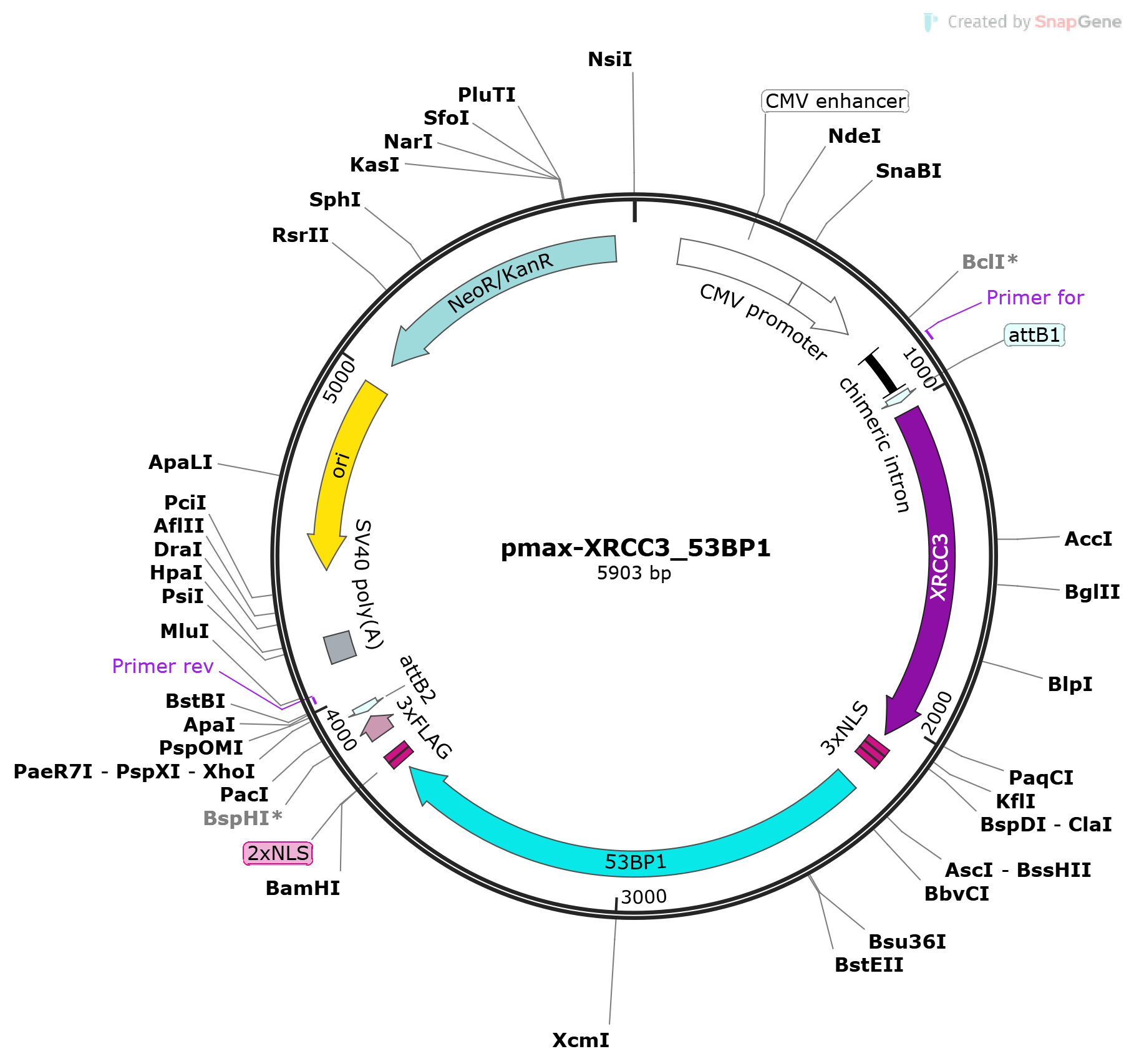 Casilio mammalian expression vector for DNA double strand breaks-sensing 53BP1, several NLS and DNA repair protein XRCC3 under the control of a CAGGS + chim intron promoter. The ORF was inserted into pmax-DEST by Gateway recombination.