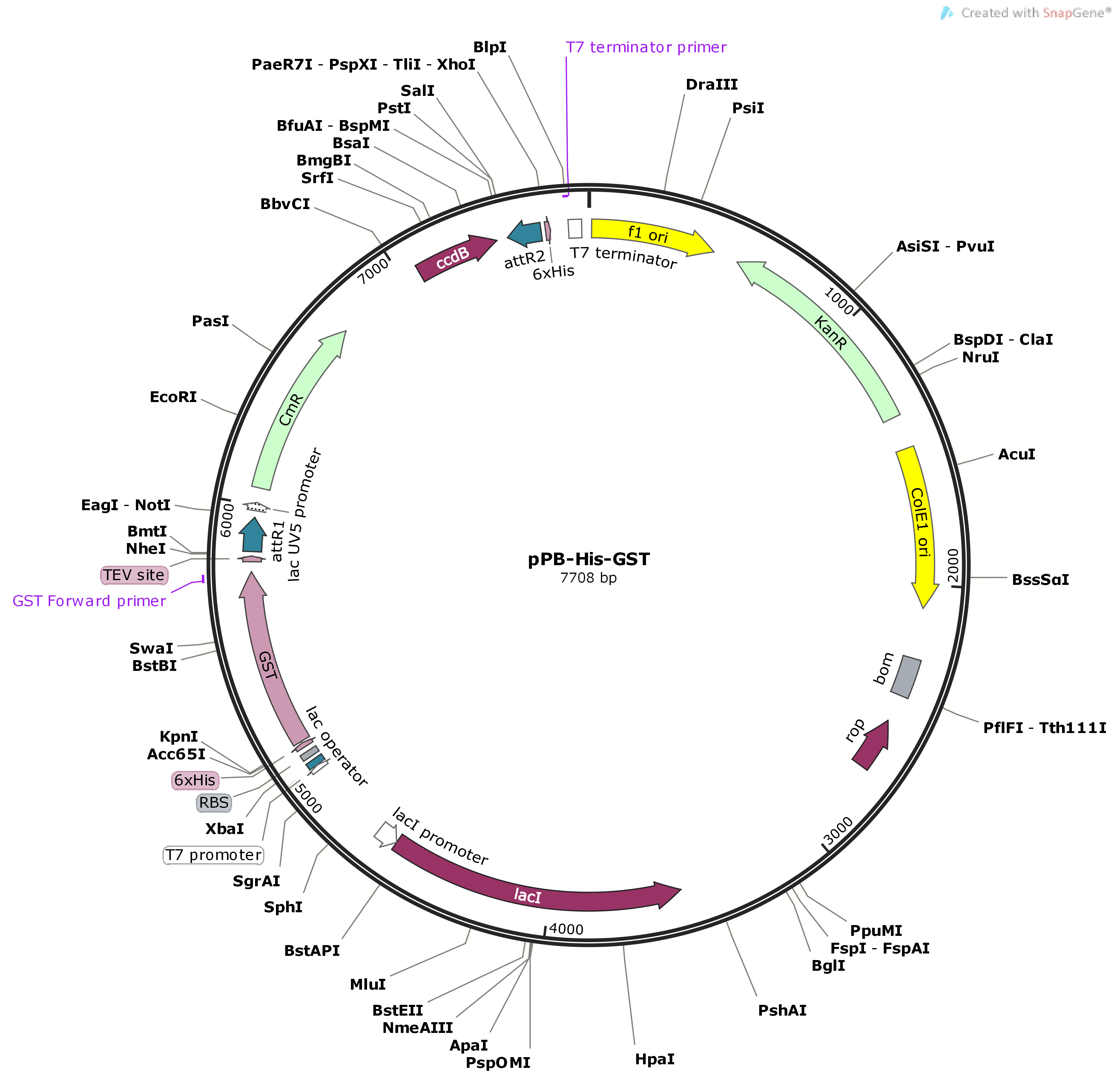 Bacterial expression vector with dual tag: Protein expression will be driven by a T7 promoter, with a 6x Histidine Tag followed by Glutathione-S-Transferase at the N terminal. Inserts are flanked by and can be excised using NheI and XhoI as long as inserts do not contain any internal NheI or XhoI sites. The His-GST Tag is cleavable with TEV.